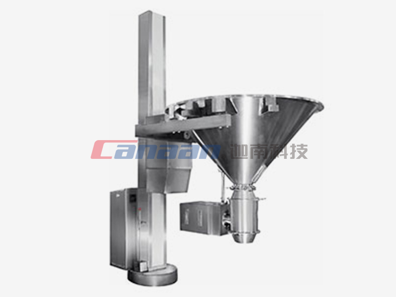 該機(jī)由NTF固定提升轉(zhuǎn)料機(jī)和ZL整粒機(jī)組成。工作時(shí),將錐形料斗與沸騰制粒機(jī)或沸騰干燥機(jī)的料倉(cāng)扣合。啟動(dòng)提升按鈕,料倉(cāng)提升;啟動(dòng)翻轉(zhuǎn)按鈕,料倉(cāng)即可翻轉(zhuǎn)180°。松開(kāi)剎車,水平旋轉(zhuǎn)立柱到工藝要求位置,再下降料倉(cāng)到工作高度,開(kāi)啟整粒機(jī)打開(kāi)蝶閥,使物料經(jīng)過(guò)整粒后密閉轉(zhuǎn)移到下一工序。